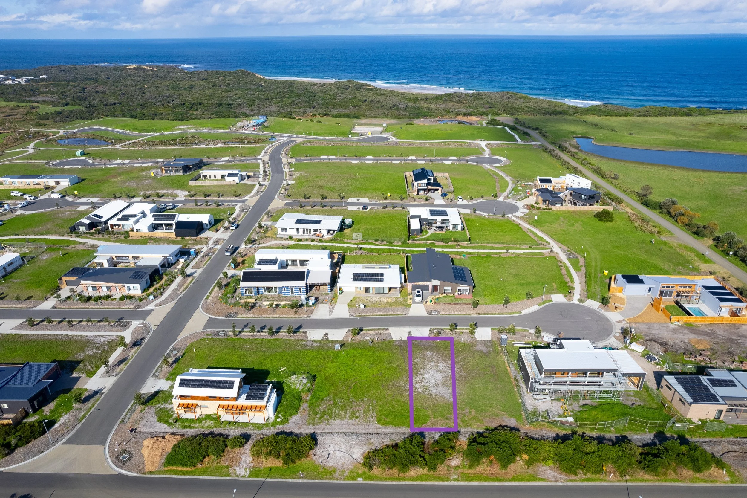 The homesite connects to the granitic sand walking paths that meander down to the main creek line corridor, creating a circuit while taking in parklands, fitness stations, open space, wetlands, sports fields, a community farm, a children’s playground, an off-leash dog park, elevated rises with ocean views, and of course, directly onto Cape Paterson’s stunning surf and swimming beaches.